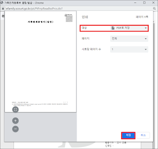 #가족관계등록부 역시 인쇄페이지로 넘어가 PDF로 저장을 클릭하면 된다.