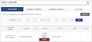 그러면 신청되며, 이와 같이 서비스 신청 내역에 건강보험 자격득실 조회 처리 완료가 나타난다.