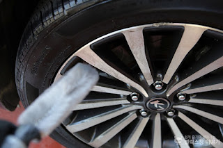 세차기 휠과 타이어 오염 상태인데요.브레이크 패드 분진 및 도로 오염물이 상당히 많이 안착되어 있습니다.타이어도 갈변현상이 나타나기 시작했는데요?한 달 정도 세차를 하지 않은 상태라서 안 좋은 모습이에요.